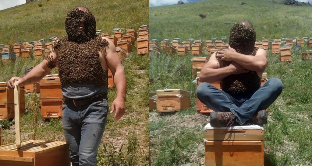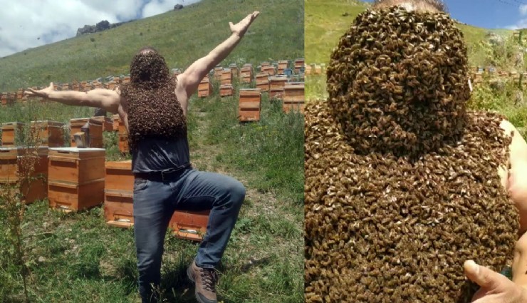 Karslı arıcı, adeta sınırları zorladı. Binlerce Kafkas arısını vücuduna alan vatandaş, adeta arı adam oldu.