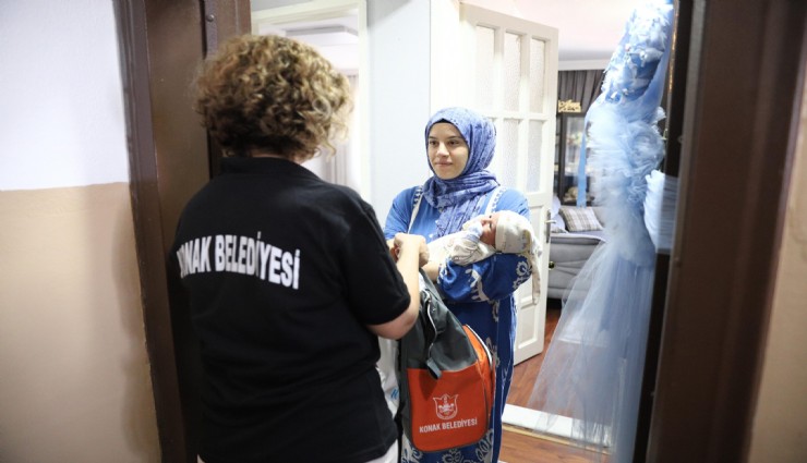 Doğumdan sonra en geç üç ay içerisinde bebeğin kimlik kartı ile birlikte Sosyal Yardım İşleri Müdürlüğü’ne yapılan başvuruların incelenmesiyle belirlenen ihtiyaçlı aileler, evinde ziyaret edilerek minik Konaklılara ilk hediyeleri Konak Belediyesi tarafından sunuluyor. Hoş Geldin Bebek çantasının içerisinde bebek bezinden ıslak beze, alt açma örtüsünden biberona, zıbından çoraba kadar bebeğin ilk günlerinde kullanılacak malzeme ve giysiler yer alıyor.