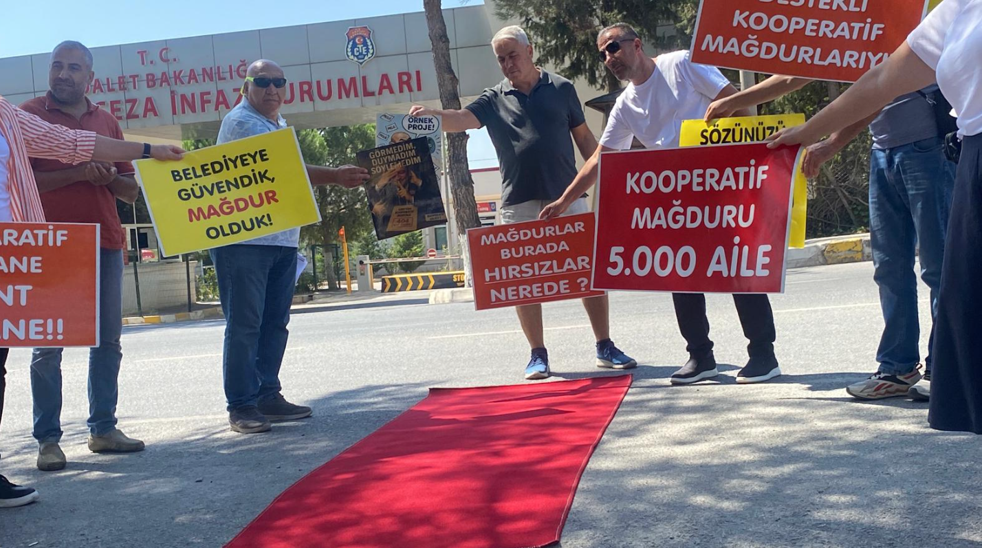 Kooperatif mağdurları, cezaevi önüne kırmızı halı sererek şu mesajı verdi: