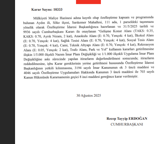 Cumhurbaşkanı Recep Tayyip Erdoğan’ın imzasıyla yayımlanan 10331 sayılı karar ile Aydın’ın Kuşadası ilçesi Güzelçamlı Mahallesi’nde bazı parseller için imar planı değişiklikleri kesinleşti.