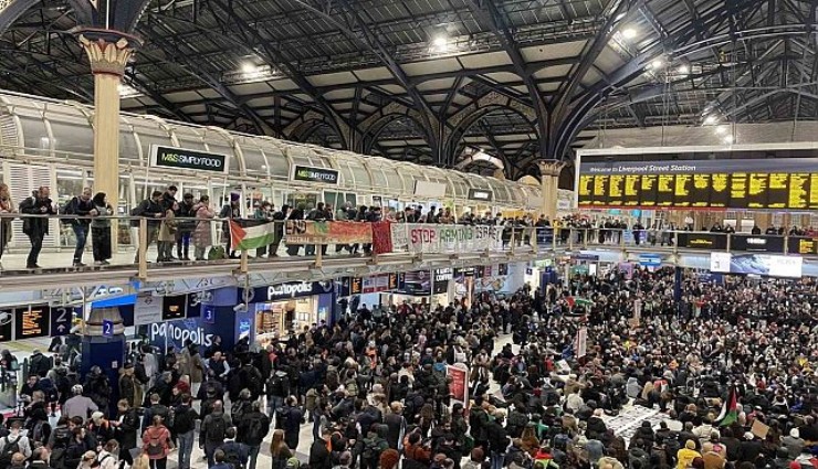 İngiltere’nin başkenti Londra’da yüzlerce kişi, Gazze Şeridi’nde ateşkes çağrısında bulunarak, Liverpool Caddesi İstasyonu’nda oturma eylemi düzenledi.