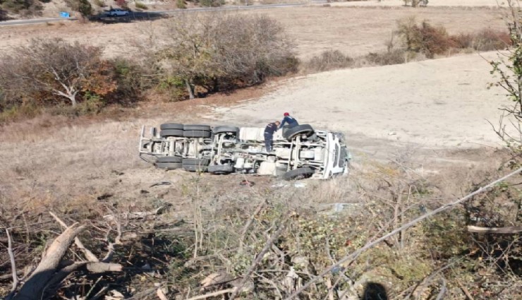 Manisa'nın Gördes ilçesinde freni boşalan beton mikserinin yoldan çıkarak boş bir araziye devrilmesi sonucu sürücü yaralandı.