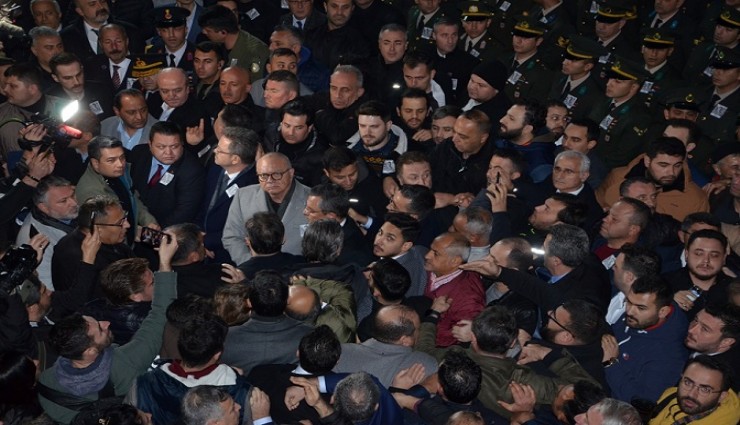 Özgür Özel, kılınan cenaze namazının ardından camiden çıkarken bu kez arbede yaşandı. Yaşanan arbedede Özgür Özel arada kalırken, genel başkanın etrafına adeta etten duvar örüldü. Özel, Manisa Valisi Enver Ünlü'nün makam aracına binerek alandan ayrılırken, bazı vatandaşların aracın önünü kesmeye çalıştığı görüldü.