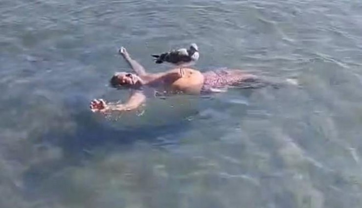 Martı denizde yüzen adamın göbeğine kondu