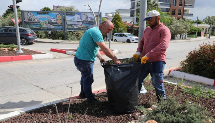Menderes Belediyesi Park ve Bahçeler Müdürlüğü yabani otların temizliği