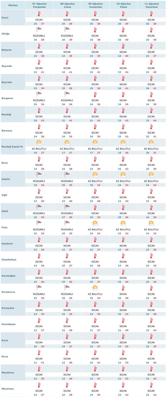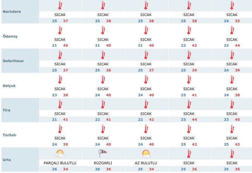 Meteoroloji Genel Müdürlüğü İzmir'in ilçeleri için 5 günlük hava durumu tahminini açıkladı.
