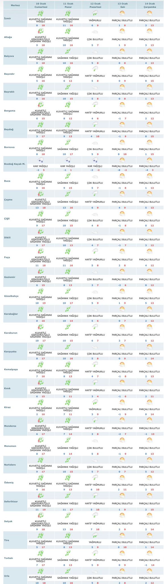 Meteoroloji Genel Müdürlüğü, İzmir için kuvvetli sağanak ve gök gürültülü yağış uyarısında bulundu. Yapılan son değerlendirmelere göre; 10 Ocak Cumartesi günü öğle saatlerinden itibaren kent genelinde etkili olması beklenen yağışların, 11 Ocak Pazar günü öğleden sonraya kadar yerel olarak kuvvetli olacağı tahmin ediliyor.