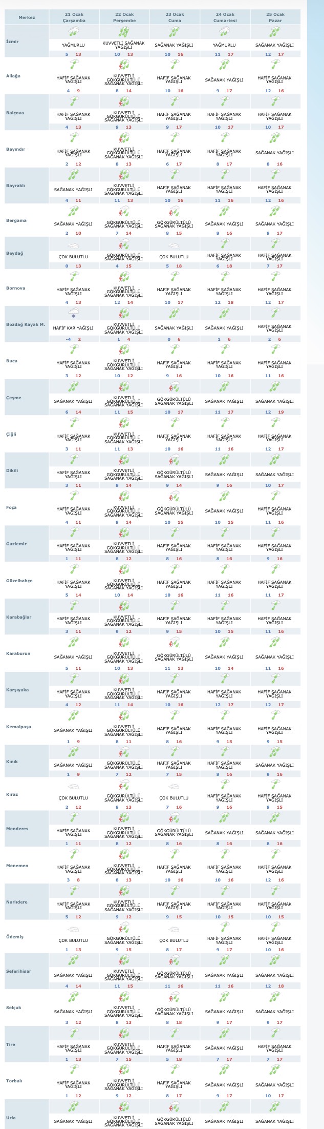 İzmir genelinde hafta boyunca çok bulutlu hava, aralıklı sağanak ve gök gürültülü sağanak yağışlar öngörülüyor. İlçe bazlı tahminlere göre; Konak, Karabağlar, Buca, Bornova, Bayraklı, Karşıyaka ve Gaziemir başta olmak üzere merkez ilçelerde sağanak yağışlar zaman zaman kuvvetlenecek. İç kesimlerde ise yağışla birlikte rüzgârın etkisini artırması bekleniyor.