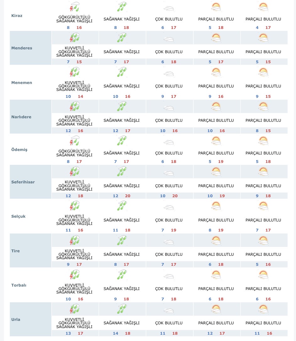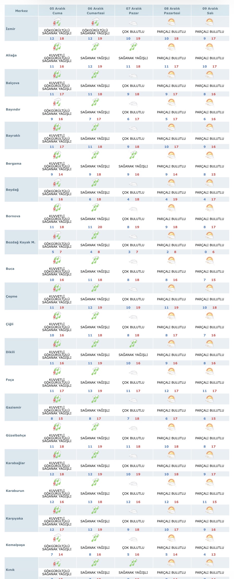 Kıyı ilçeler Çeşme, Urla, Seferihisar, Foça ve Dikili de hafta sonunu sağanak geçirecek. İç kesimlerde yer alan Kemalpaşa, Torbalı, Tire, Ödemiş, Bayındır ve Kiraz ilçelerinde de benzer şekilde gök gürültülü sağanak görülecek. 7 Aralık Pazar günü yağışların büyük bölümünde yerini çok bulutlu bir görünüme bırakacağı tahmin ediliyor.