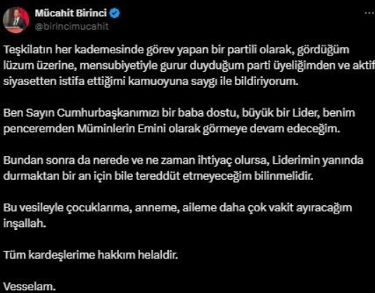 Söz konusu kararın ardından Birinci, partisinden istifa ettiğini açıkladı. Sosyal medya hesabından yaptığı açıklamada Birinci, şu ifadelere yer verdi: "Teşkilatın her kademesinde görev yapan bir partili olarak, gördüğüm lüzum üzerine, mensubiyetiyle gurur duyduğum parti üyeliğimden ve aktif siyasetten istifa ettiğimi kamuoyuna saygı ile bildiriyorum. Ben Sayın Cumhurbaşkanımızı bir baba dostu, büyük bir Lider, benim penceremden Müminlerin Emini olarak görmeye devam edeceğim. Bundan sonra da nerede ve ne zaman ihtiyaç olursa, Liderimin yanında durmaktan bir an için bile tereddüt etmeyeceğim bilinmelidir. Bu vesileyle çocuklarıma, anneme, aileme daha çok vakit ayıracağım inşallah. Tüm kardeşlerime hakkım helaldir. Vesselam."