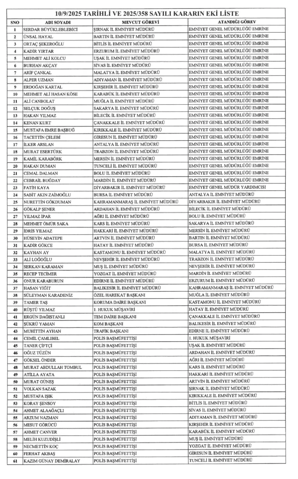 Emniyet Müdürlüğü atama kararları Cumhurbaşkanı Recep Tayyip Erdoğan'ın imzasıyla 11 Eylül 2025 tarihli Resmi Gazete'de yayımlandı.