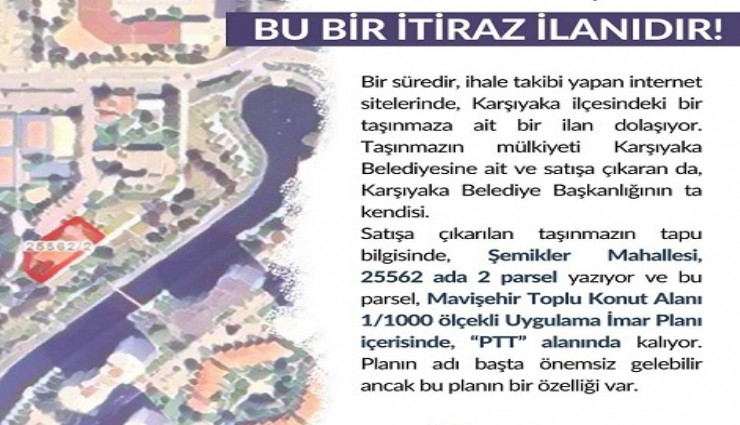 Açıklamada bir süredir, ihale takibi yapan internet sitelerinde, Karşıyaka ilçesindeki bir taşınmaza ait bir ilan dolaştığı hatırlatılarak şu bilgiler verildi: “Taşınmazın mülkiyeti Karşıyaka Belediyesine ait ve satışa çıkaran da, Karşıyaka Belediye Başkanlığının ta kendisi.Satışa çıkarılan taşınmazın tapu bilgisinde, Şemikler Mahallesi, 25562 ada 2 parsel yazıyor ve bu parsel, Mavişehir Toplu Konut Alanı 1/1000 ölçekli Uygulama İmar Planı içerisinde, "PTT" alanında kalıyor. Planın adı başta önemsiz gelebilir ancak bu planın bir özelliği var. 2020[1] yılında TOKİ tarafından açık arttırmaya çıkarılan ve satışına Karşıyaka Belediyesi tarafından itiraz edilen taşınmazlar da, bu planda yer alıyordu. TOKİ, toprak parçaları ile yetinmemiş, denize isabet eden alanları bile satışa çıkarmıştı.”