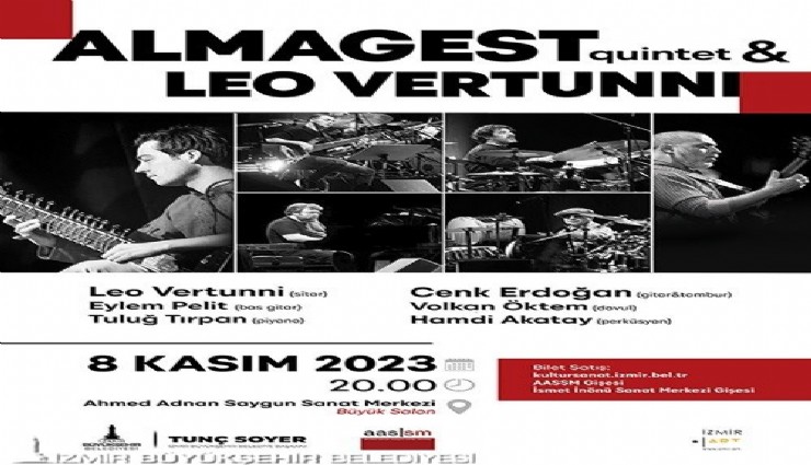 Türk ve Batı müziğini sentezleyip müziğe evrensel bir boyut kazandırmak için kurulan Almagest Quintet & Leo Vertunni, 8 Kasım’da AASSM Büyük Salon’da saat 20.00’de sahne alacak. Davulda Volkan Öktem, basgitarda Eylem Pelit, klasik gitar ve tamburda Cenk Erdoğan, piyanoda Sabri Tuluğ Tırpan, perküsyonda Hamdi Akatay ve sitarda Leo Vertunni’den oluşan grup izleyenlere unutulmaz anlar yaşatacak. 8 Kasım’da Küçük Salon’da ise seslerin ve ritimlerin büyüsünün hakim olacağı Timuçin Şahin, Ali Perret ve Can Kozlu’dan kurulu “ACT” konseri var. Etkinlik ücretsiz olacak.