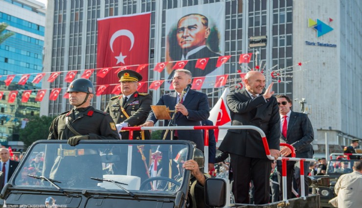 Konuşmaların ardından Cumhuriyet Meydanı’nda resmi geçit törenleri başladı. Vali Elban, Başkan Soyer ve Orgeneral Yeni, resmi geçidi ayakta selamladı. Törende, Türk Silahlı Kuvvetleri’nin kara, deniz ve hava birliklerinden Türk Polis Teşkilatı’na, İzmir Büyükşehir Belediyesi ekiplerinden oda ve meslek kuruluşlarına, okullardan barolara, kooperatiflerden derneklere resmi geçide katılarak Cumhuriyetin 100. yılını selamladı.