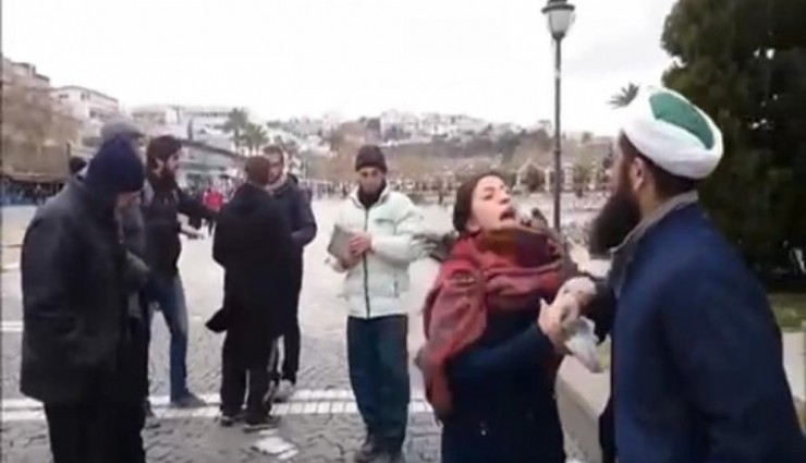Sakallı ve cübbeli iki kişinin elinden broşürleri alan kadın ve çevresindekiler, bu bildirileri buruşturarak, dağıtılmasına engel oldu.