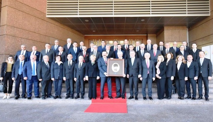 İzmir Ticaret Odası Yönetim Kurulu Başkanı Mahmut Özgener, Ege Bölgesi Sanayi Odası Yönetim Kurulu Başkanı Ender Yorgancılar, İzmir Ticaret Borsası Yönetim Kurulu Başkanı Işınsu Kestelli ve Deniz Ticaret Odası İzmir Şubesi Yönetim Kurulu Başkanı Yusuf Öztürk’ün iştirakleriyle, İzmir Ticaret Odası, Ege Bölgesi Sanayi Odası, İzmir Ticaret Borsası ve Deniz Ticaret Odası İzmir Şubesi’nin Yönetim Kurulu Üyeleri ve Meclis Başkanlık divanlarından oluşan 42 kişilik heyet Türkiye Odalar ve Borsalar Birliği Başkanı M. Rifat Hisarcıklıoğlu’nu ziyaret etti.