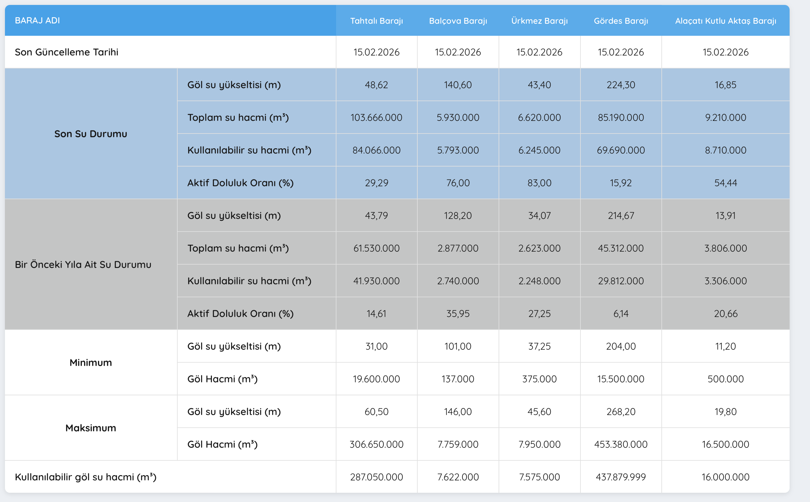 Manisa’nın Gördes ilçesinde bulunan ve İzmir’e de su sağlayan Gördes Barajı’nda ise doluluk oranı %15,92 olarak kaydedildi. Göl suyu yüksekliği 224,30 metreye ulaşırken, toplam su hacmi 85 milyon 190 bin metreküp, kullanılabilir su hacmi ise 69 milyon 690 bin metreküp oldu. Geçen yıl aynı dönemde doluluk oranı %6,14 seviyesindeydi. Artış yaşanmasına rağmen barajın hâlâ düşük seviyede olduğu görülüyor.