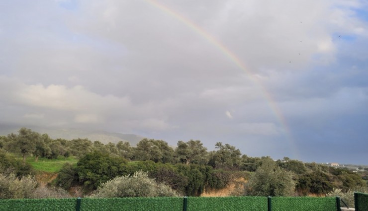 Aydın’ın Efeler ilçesinde etkili olan sağanak yağışın ardından ortaya çıkan gök kuşağı, gökyüzünde görsel şölen oluşturdu.