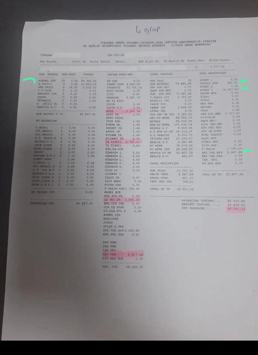 Sendika tarafından paylaşılan bordroda yeşil kalemle işaretlenen satırlara dikkat çeken Tugay, bu kalemlerin çeşitli nedenlerle yapılan kesintileri gösterdiğini ifade etti. Tugay, “Bahsi geçen çalışanımız 26 gün çalışması gerekirken yalnızca 20 gün çalışmış, ücretsiz izin kullanmış ve daha önce aldığı avans nedeniyle 16 bin 947 TL’lik bir kesinti yapılmış. Ayrıca Erzurumlular Derneği’ne yapılan gönüllü yardım kesintisi de bordroda yer alıyor. Tüm bu kalemler çıkarıldığında maaşın neden eksik göründüğü net şekilde ortaya çıkıyor” dedi.