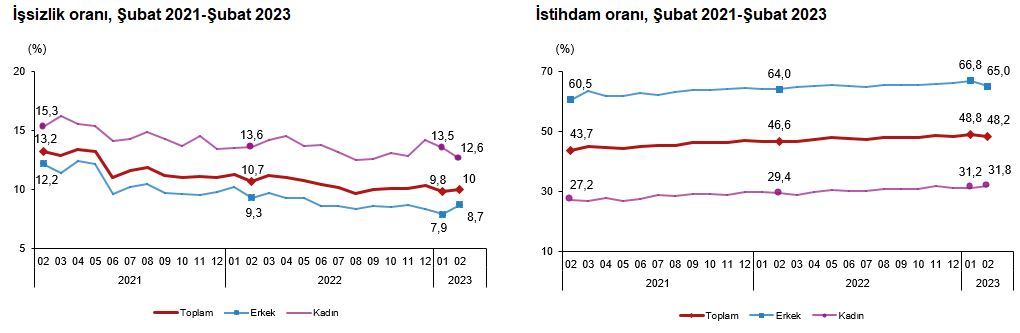 Hanehalkı İşgücü Araştırması sonuçlarına göre; 15 ve daha yukarı yaştaki kişilerde işsiz sayısı 2023 yılı Şubat ayında bir önceki aya göre 65 bin kişi artarak 3 milyon 514 bin kişi oldu. İşsizlik oranı ise 0,2 puan artarak %10,0 seviyesinde gerçekleşti. İşsizlik oranı erkeklerde %8,7 iken kadınlarda %12,6 olarak tahmin edildi.