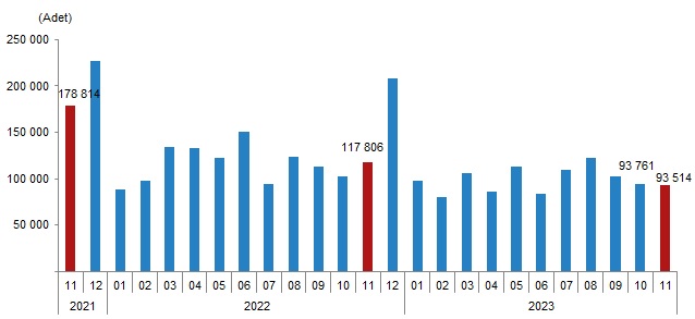 Türkiye genelinde konut satışları Kasım ayında bir önceki yılın aynı ayına göre %20,6 azalarak 93 bin 514 oldu. Konut satışlarında İstanbul 15 bin 187 konut satışı ve %16,2 ile en yüksek paya sahip oldu. Satış sayılarına göre İstanbul’u 8 bin 250 konut satışı ve %8,8 pay ile Ankara, 5 bin 105 konut satışı ve %5,5 pay ile İzmir izledi. Konut satış sayısının en az olduğu iller sırasıyla 52 konut ile Hakkari, 57 konut ile Ardahan ve 73 konut ile Gümüşhane oldu.