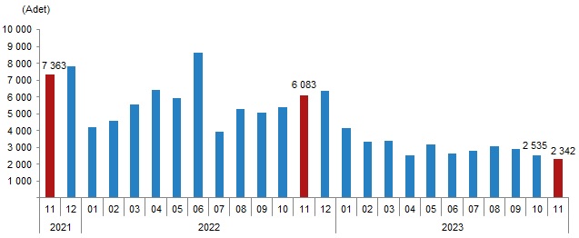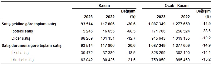 Konut satışları Ocak-Kasım döneminde bir önceki yılın aynı dönemine göre %14,9 azalışla 1 milyon 87 bin 349 olarak gerçekleşti.