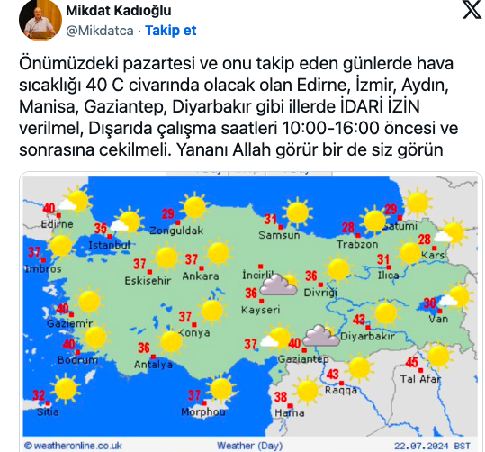Kadıoğlu sosyal medya hesabından yaptığı açıklamada, “Olağanüstü düzeylerde seyreden sıcaklıklarla ilgili önemli bir uyarıda bulundu. Kadıoğlu, “Önümüzdeki pazartesi ve onu takip eden günlerde hava sıcaklığı 40 derece civarında olan Edirne, İzmir, Aydın, Manisa, Gaziantep, Diyarbakır gibi illerde idari izin verilmeli. Dışarıda çalışma saatleri 10.00-16.00 öncesi ve sonrasına çekilmeli. Yananı Allah görür bir de siz görün” ifadelerini kullandı.