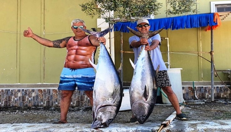 Urla’da amatör balıkçıların oltasına insan boyunda iki orkinos takıldı