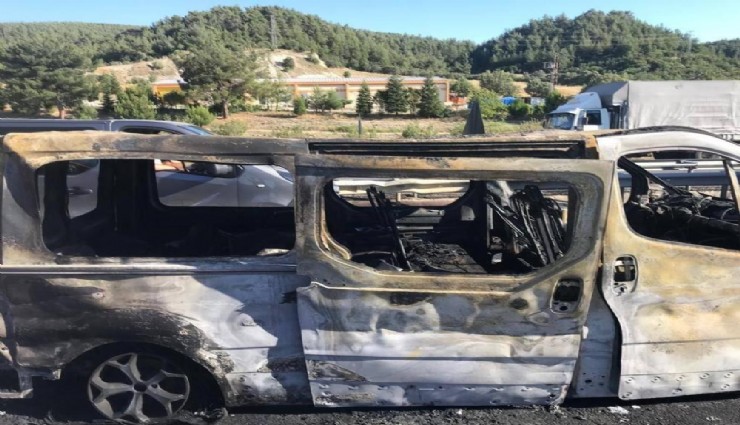 Uşak’ta bariyerlere çarptıktan sonra alev alan araç kullanılmaz duruma geldi.