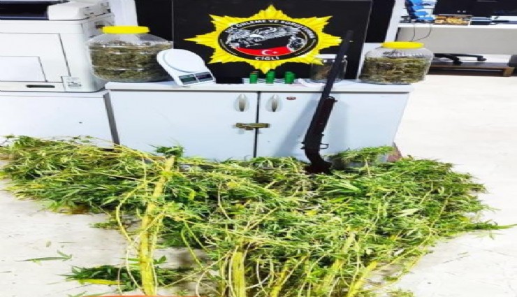 Çiğli İlçe Emniyet Müdürlüğü Suç Önleme Ve Soruşturma Büro Amirliğine bağlı ekipler, uyuşturucu madde ticareti yapan şahıslara yönelik çalışmalar çerçevesinde, H.K. (46) adlı bir kişinin, Karşıyaka ilçesi Cumhuriyet Mahallesinde bulunan ikametinden uyuşturucu yetiştirdiği, babasının ikametinde kurutarak satışa hazır hale getirdiği bilgisini edindi. Harekete geçen ekipler adreste yapılan aramada, 6 adet saksı içerisinde boyları yaklaşık 2 metre uzunluğunda kenevir bitkisi, 1 adet kavanoz içerisinde esrar maddesi ve 1 adet tek kırma av tüfeği ile 9 kartuş ele geçirildi. H.K.’nın babası olan K.K.’nin (64) evinde yapılan aramada ise, 1 adet 5 litrelik, 1 adet 10 litrelik bidonlar içerisinde 632 gram esrar maddesi ile 1 adet hassas terazi ele geçirildi.
