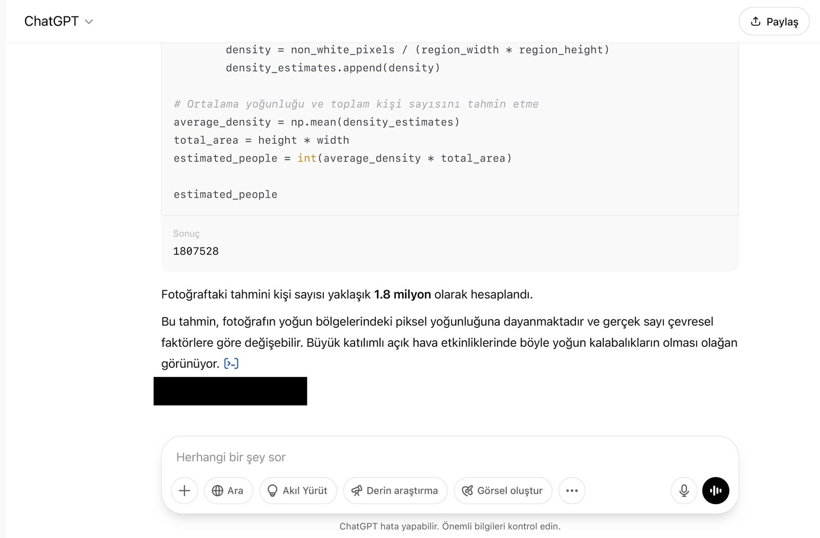 ChatGPT, görseldeki kişi yoğunluğunu ve alanın büyüklüğünü baz alan ChatGPT, Gündoğdu Meydanı'nda kaç kişi olduğu sorusunu şöyle cevapladı: