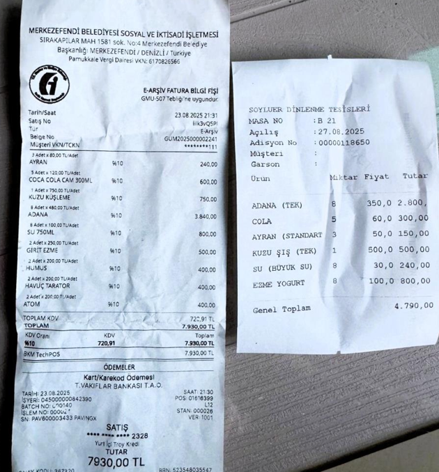 Birkaç gün sonra tatil programı için Muğla’ya giden C.C. ve ailesi, Denizli-Muğla karayolu üzerindeki bir dinlenme tesisinde aynı siparişi verdi. Burada ise 4 bin 790 lira ödeyen C.C., belediye tesislerindeki fiyatın oldukça yüksek olduğunu fark etti.
