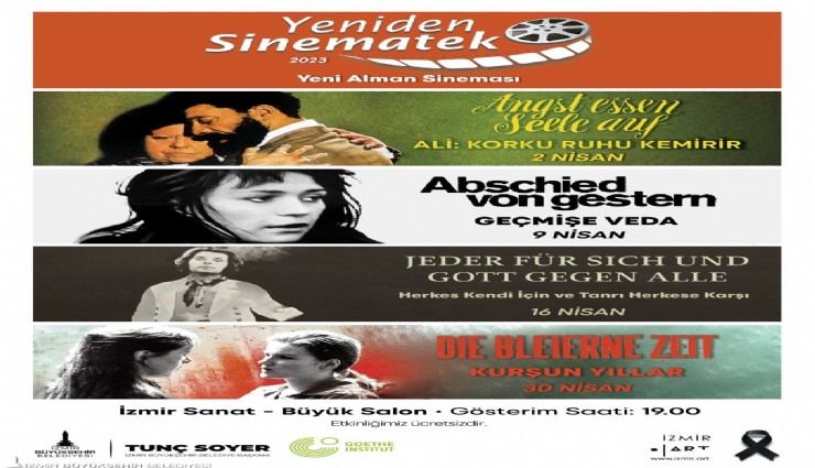 İzmir Büyükşehir Belediyesi “Yeniden Sinematek” gösterimlerinde Nisan ayında “Yeni Alman Sineması” temasıyla dört filmi İzmirli sinemaseverlerle buluşturacak. Rainer Werner Fassbinder’nin “Ali: Korku Ruhu Kemirir”, Alexander Kluge’nin “Geçmişe Veda”, Werner Herzog’un “Herkes Kendi İçin ve Tanrı Herkese Karşı” ve Margarethe von Trotta’nın “Kurşun Yıllar” filmleri izleyenlere unutulmayacak anlar yaşatacak. Filmler, Kültürpark İzmir Sanat ve Seferihisar Kültür Merkezi’nde ücretsiz gösterilecek.
