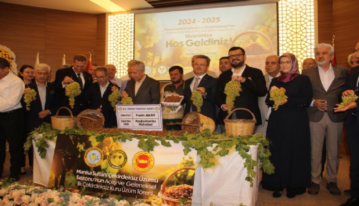 Manisa Ticaret Borsasında, Manisa Çekirdeksiz Sultani Üzümde 2024-2025 sezonunun açılışı ve geleneksel ilk kuru üzüm alım töreni gerçekleştirildi. Törene Manisa Valisi Enver Ünlü, TBMM 22. Dönem Meclis Başkanı Bülent Arınç, Manisa Büyükşehir Belediyesi Genel Sekreter Yardımcısı Ali Kılıç, AK Parti Manisa Milletvekili Tamer Akkal, CHP Manisa Milletvekili Ahmet Vehbi Bakırlıoğlu, Manisa Celal Bayar Üniversitesi Rektörü Prof. Dr. Rana Kibar, daire ve kurum müdürleri ile üreticiler katıldı.