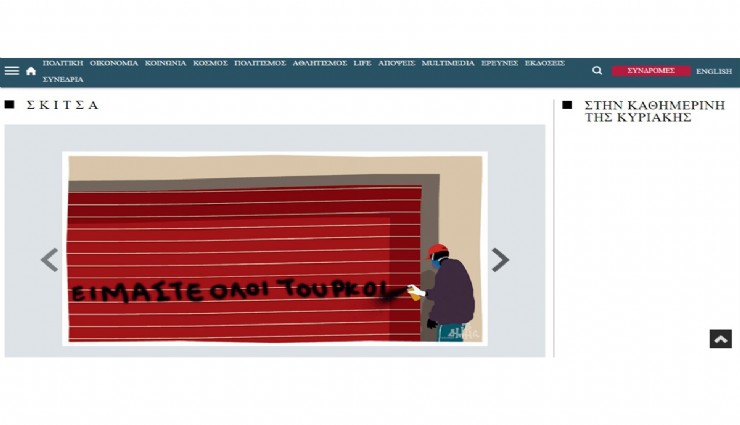 Yunanistan'ın önde gelen gazetelerinden Kathimerini, Türkiye'nin 10 ilini yıkan ve binlerce vatandaşın hayatını kaybettiği deprem ile ilgili yayınlanan karikatürde Türk halkının yanında olduklarını vurgulayarak “Hepimiz Türküz” ifadesine yer verdi. Yunan gazetesinin karikatürü tahrikleri ve provokasyonları ile tanınan Fransız Charlie Hebdo’nun dünkü aşağılık karikatürüne cevap niteliğindeydi.