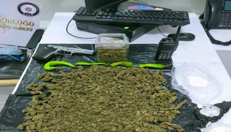 Bayraklı İlçe Emniyet Müdürlüğü Devriye Ekipler Amirliği ekipleri tarafından yapılan çalışmalarda bir şüphelinin 45 dakika içerisinde 2 kişiye uyuşturucu sattığı tespit edildi. Zehir tacirini yakalamak için harekete geçen ekipler, şüpheli C.T.'yi gözaltına aldı. Şüphelinin evinde yapılan aramada 1 kilo 120 gram esrar, 55 gram metamfetamin ve 1 adet tabanca ele geçirildi. Gözaltına alınan C.T.’nin emniyetteki işlemlerinin ardından adliyeye sevk edildiği öğrenildi.