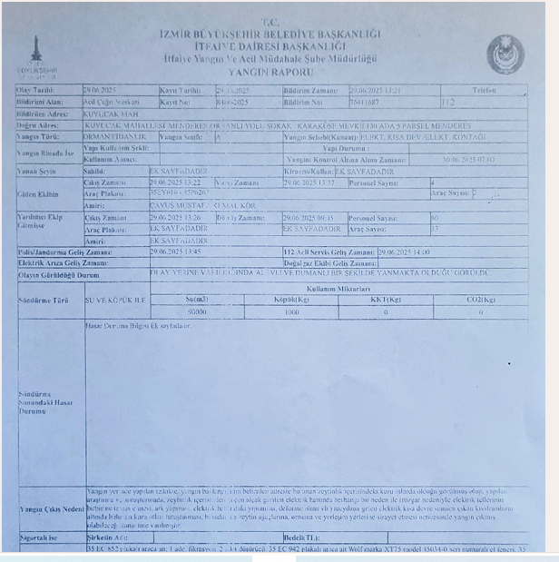 Doğankent'te evleri yanan mağdurlara yaklaşık bir hafta 10 gün sonra ulaşan ilk İzmir Büyükşehir Belediyesi İtfaiye raporunda yangının çıkış sebebi (kanaat) olarak "elektrik kısa devre/elektrik kontağı" yazılıydı.